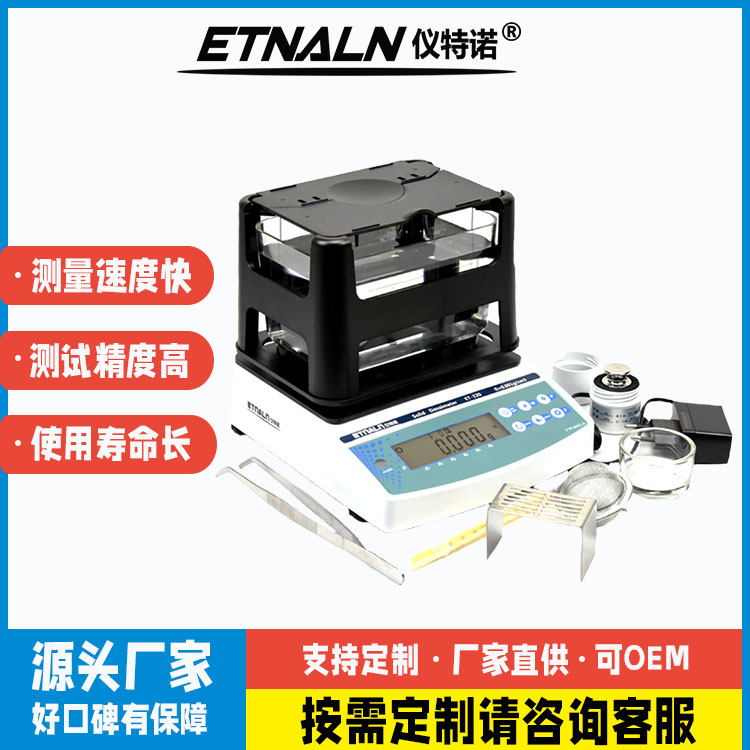 阿基米德原理固體密度測試儀大多采用純水作為測量介質,以水作介質既實惠又方便;特殊時候也可以換成別的液體,儀特諾ET-320固體密度測試儀可以自由設置溶液補償。