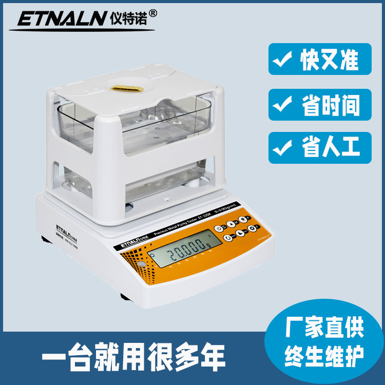 儀特諾黃金密度計_貴金屬純度檢測儀_黃金首飾檢驗真假的儀器ET-320K、ET-600K 、ET-1200K,無需捆綁測試樣品,僅兩個步驟:先測量空氣中重量,按ENTER鍵,再放入水中測水中重量,按ENTER鍵,即可準確、快速的顯示黃金K值、%含量、密度值;如果是測鉑金,即2步直接顯示鉑金PT值、%含量、密度值;或測銀就直接得出銀S值、%含量、密度值;也可以測量黃金或及其它合金的%含量、密度值。