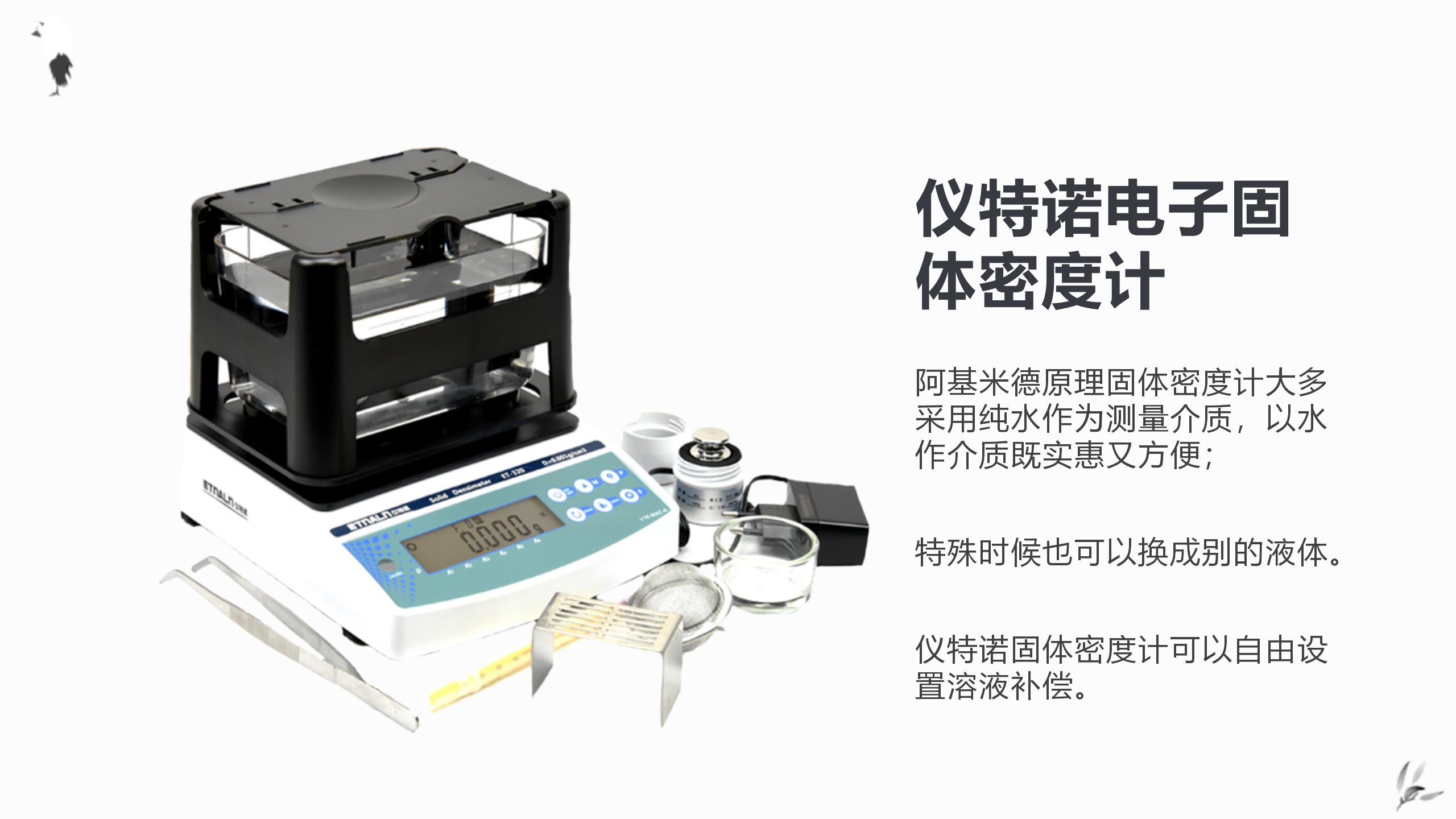 固體電子密度計,以純水作為常規測量介質,不僅經濟實惠,而且方便操作。在特殊情況下,用戶還可以更換為其他液體。儀特諾固體密度計的又一大特色是可自由設置溶液補償,支持酒精、硅油等其它不同介質的更換,極大地方便了那些需要測試水溶性產品的用戶。