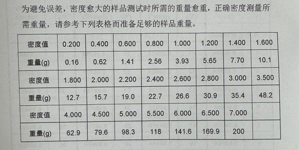對于固體樣品,通常是要看你要測試的具體產品,不同密度的產品,對取樣重量是不一樣的。以下的表格可以供參考: